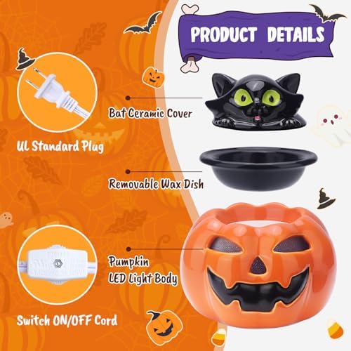 - Ideal para añadir ambiente a tu sala de estar, dormitorio u oficina, este calentador de cera de Halloween también es un regalo perfecto para los amantes de Halloween o cualquiera que disfrute crear un ambiente acogedor con aromas de temporada. ¡Abraza el espíritu de Halloween con este encantador y funcional calentador de cera!