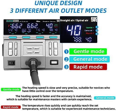 - NEW FEATURE: Hot Air Rework Station has 3 different air outlet modes, gentle, general, and rapid, each mode has a different airspeed, choose different modes according to different habits.