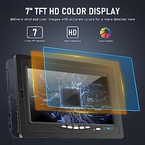 - CRYSTAL-CLEAR IMAGES: The snake camera boasts a 7-inch Color TFT monitor equipped with a sun visor, ensuring effective outdoor inspections. Additionally, with IP68 waterproof camera probe, 12pcs adjustable white LED lights and self leveling function, you can always capture accurate and vivid images even in total darkness, underground or underwater. If you ever encounter any issues, please don't hesitate to contact us via Amazon message system with your order information.