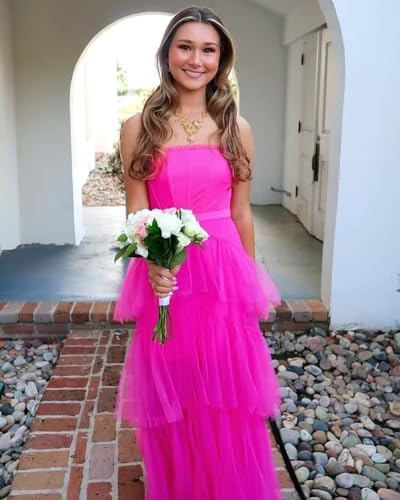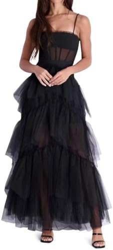 Tulle Prom Dresses for Women Formal Long Tiered Ruffled Ball Gown A Line Spaghetti Straps Evening Party Gowns