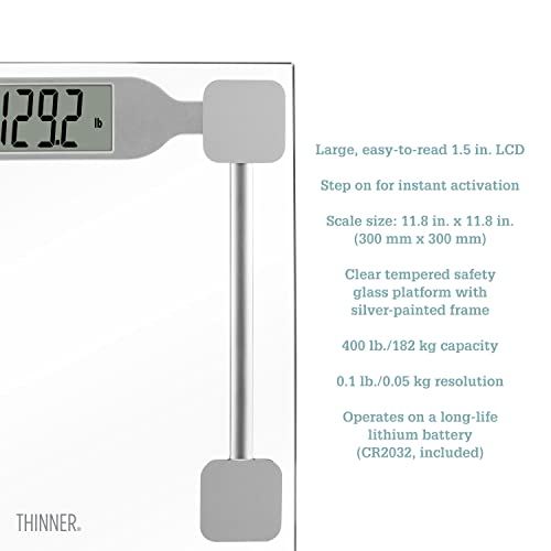 - Digital Bathroom Scale with Durable Construction: Sturdy, comfortable platform large 11.8 inches x 11.8 inches with 1 inch platform, of impact-resistant Thinner by Conair Glass Digital Bathroom Scale weighs up to 400 lb. (182 kg). Tempered Safety Glass: Clear glass and silver-painted frame provide an elegant, contemporary look.