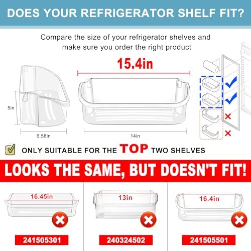 - 【Notice Length 15.38"-ONLY FIT Top 2 Shelves】Suitability and durability are your first choice when you are concerned about refrigerator replacement 240356402 shelf bin parts. We use rigorous testing to ensure the suitability of our products for buyers' refrigerator shelves. Maximum Length: 15.38", Front Height: 5", Depth: 6.65". NOT FIT 240324502, 240363702, 216959802, 241505501, 241505301. Please check your refrigerator door shelf size carefully before purchasing