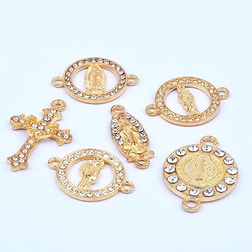 30pcs Golden Alloy Mixed Rhinestone Religious Cross and Center Miraculous Medal Charms Our Lady Virgin Mary Jesus Pendant Links for DIY Rosary Beads Necklace Jewelry Making, 6 Styles
