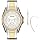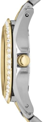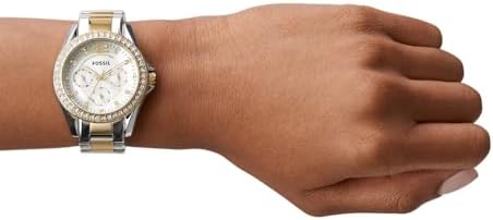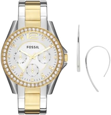 The Fossil Riley women's watch and earring set features a polished two-tone stainless steel case and bracelet band with silver dial and gold-tone accents. The 2 inch silver hoop earrings have a fish hook closure and French wire back finding. The quartz watch has a round silver enamel dial with a modern beveled design. The bracelet band is adjustable from 6 to 8 inches with removable links. This stylish watch and earring set is perfect for any woman looking for a sophisticated, modern look.
