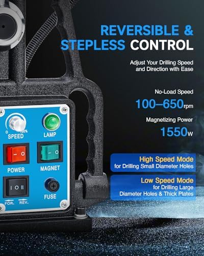 ZELCAN Magnetic Drill Press with 6 Drill Bits, 1550W Mag Drill Press with 2" Dia. 3125 lbf/13900N Mag Force, 650 rpm Power Magnetic Drill with Stepless Speed & Reversible Direction for Metal Surface
