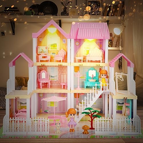 Girls Doll House for 3 4 5 6 7 8 Year Old Toy, Dollhouse Furniture and Accessories Pink Toy House Princesses, DIY Building Playset Pretend Play Toddler Doll Houses for Kids Age 3+ Gift