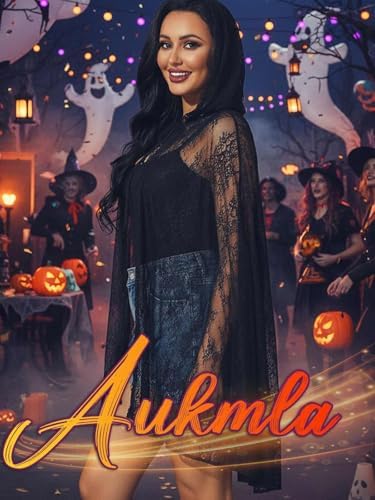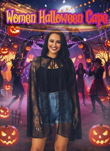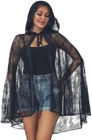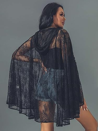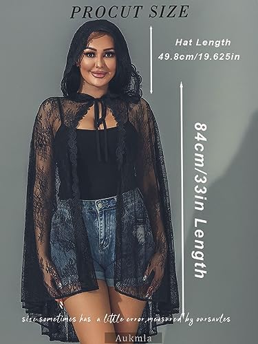 Aukmla Lace Hooded Cloak Black Short Sheer Cape Halloween Costume Cloaks Cover Up for Women and Girls