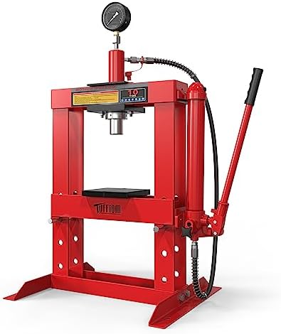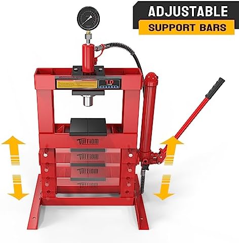 TUFFIOM 10-Ton Hydraulic Shop Press with Pressure Gauge & Press Plates, H-Frame Adjustable Working Table Height Garage Benchtop Press, Red, 23.5”L x 19.5”W x 40”H