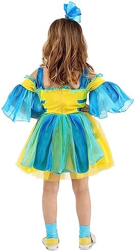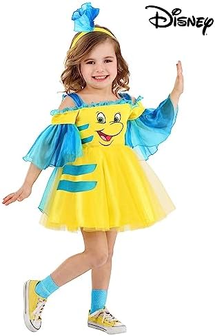 Flounder Dress Costume for Toddlers: While Disney's Ariel dreamed of dry land, we wanted to be mermaids! And if your kiddo would rather take it one step further and look like her fish friend instead, we have just what they need. Our Toddler Flounder Costume Dress puts a fashionable spin on this adorable character's design. The yellow dress zips down the back for easy wear and has elastic in the waistband for a comfortable fit. The skirt has a glitter overlay, and Flounder's face is printed on the bodice. Ruffled blue fabric at the shoulders and sleeves imitate his fins, and the included headband completes the look. Your kiddo will have the very best of ocean fashion when they put on this delightful outfit! Product Details: Skirt, shoulder straps, & ruffles: 100% polyester satin, tulle, & organza; bodice: 87% polyester, 13% spandex stretch knit Dress has back zipper Stretch knit bodice has organza shoulder straps & off-shoulder ruffles Flounder's face is printed on bodice front Skirt has satin base layer, glittery tulle overlay Fabric covered plastic headband has organza ruffle on top Officially licensed Disney Flounder costume About Us: Fun Costumes are exclusively made by us and begin with passion, teamwork, and industry expertise - proof that with the right people even a simple idea can grow into something incredible. We started in a small garage in Minnesota, and now we're creating costumes for people all around the world. - Dress - Headband