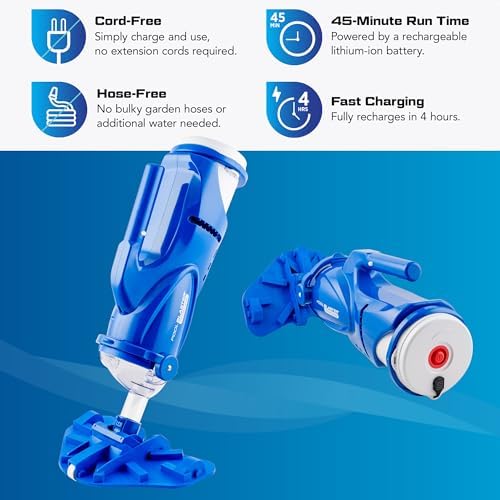 - RUN TIME: Cordless pool vacuum operates on a lithium-ion battery and runs up to 45 minutes.