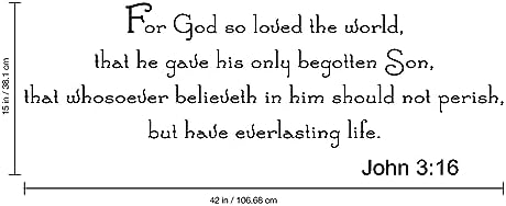 • Our high quality inspirational vinyl decal "John 3:16" adhesive design comes in 15 inches by 42 inches. The pictures are for display and inspiration only. All of our vinyl wall decals are manufactured with premium industrial grade Lutema self-adhesive vinyls.