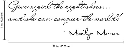 - Our high quality inspirational vinyl decal "Give a girl shoes and she can conquer the world - Marilyn Monroe" adhesive design comes in 6 inches by 23 inches. The pictures are for display and inspiration only. All of our vinyl wall decals are manufactured with premium industrial grade Lutema self-adhesive vinyls.