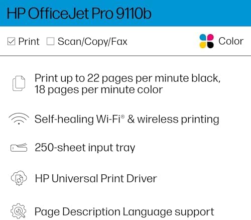 - FROM AMERICA'S MOST TRUSTED PRINTER BRAND – The OfficeJet Pro 9110b is perfect for offices printing professional-quality color documents like presentations, brochures and flyers. Print speeds up to 18 ppm color, 22 ppm black. Great for remote teams.