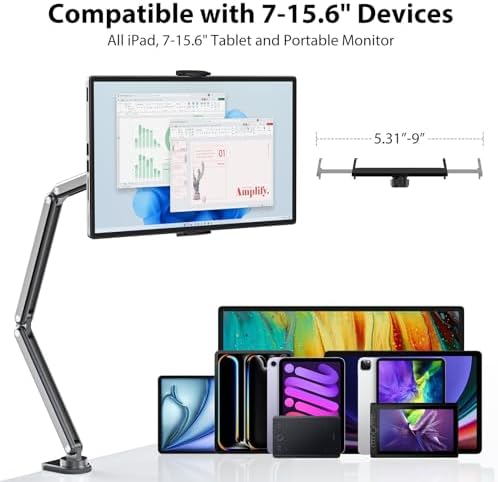 - 【Wide Compatibility】 This tablet arm stand for desk comes with a 5.31-9 inch retractable clip, perfectly compatible with iPad Pro 11/13 inch, iPad Air 11/13 inch, iPad 10/9th Gen, iPad Air 4/5, iPad mini 5/6, Samsung Galaxy Tab S9/S9+ Plus/S9 FE/S9 FE+/S9/S8/S8+/S8 Ultra/A9+/A8/S7/S6/S6 Lite series, Kindle Fire HD 10/8, Surface Pro 9/8/7, and more 7 to 15.6 inch portable monitors, drawing tablets, e-readers. No need to remove the tablet case while using.