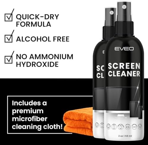 - Your Screens' New Best Friend: EVEO's Screen Cleaner Spray and Plush Microfiber Cloth are a dynamic duo for your TV, computer, monitor, laptop, iPad, car screen and more. They collaborate seamlessly to effortlessly remove dust, fingerprints, and smudges, leaving your screens crystal-clear. They're your screens' trusted companions.