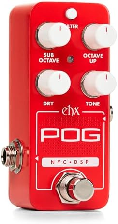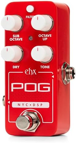 EHX’s smallest and most powerful compact Polyphonic Octave Generator yet. The Pico POG takes the streamlined simplicity of the Micro and Nano POGs and fits it all into an ultra-compact chassis and adds a powerful tone control. The tightest octave effect now fits on the tightest of pedalboards. The EHX Pico POG features a lighting fast feel that will track every note and chord you play with precision. Dial in Sub Octave to add stumble rumble or monstrous thunder. Add Octave Up for ethereal air or max it out to shred into another galaxy. Perfectly blend 3-voice tones for fat synthy madness. The 3 mode Tone control lets you tailor your sound to fit into any pocket no matter how massive or small. Controls on the Pico POG include dedicated volumes knobs for the SUB OCTAVE, OCTAVE UP, and DRY voices. These three controls act as a mixer for infinite possible voice mixes. The TONE knob features three modes controlled by the FILTER button. In Tone Mode, the knob acts as a tilt-EQ with a flat frequency response in the center, more treble and less bass as you turn the knob clockwise, and less treble and more bass as you turn the knob counterclockwise. In this mode, the EQ is applied to all 3 voices. In Low Pass Filter mode, the knob cuts highs in the Sub and Octave Up voices, while High Pass Filter mode cuts lows in the Sub and Octave Up Voices.