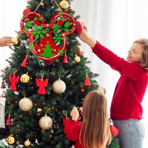 - [Unique Design]: The Christmas door decorations are uniquely shaped in the shape of mouse head, using Christmas trees, castles, colorful lights, snowflakes and other elements to make the wooden sign full of dreamy and Christmas atmosphere, so that you can spend a fantastic Christmas party