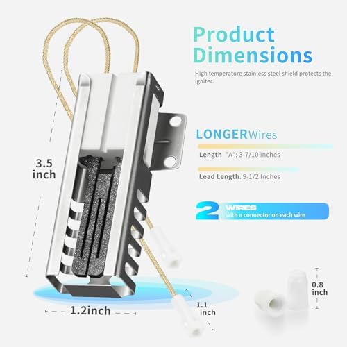 - >>>>DETAILED INFORMATION: Length "A": 3-7/10 Inches, Lead Length 9-1/2 Inches, 1.1 Inch Plug Length, Electrical rating 3.3 to 3.8 Amps, 120VAC, Plug-in installation. This DG94-01012A igniter has two separate connectors (2 wires 2 connector