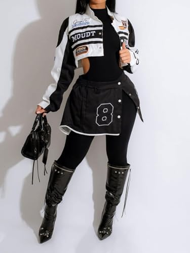 Varsity Letterman Jacket - Vintage Racing Bomber Motorcycle Women's Cropped Detachable Streetwear (Black, XXL, XX-Large)