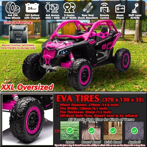 - Official Licensed 24 Volt Ride On Car: This 24V 2-Seater Kids Car is licensed CAN-AM side by side UTV with realistic appearance of Maverick off-road vehicle, providing excellent performance: the 24V removable and rechargeable battery provides strong power, 4pcs 200W motors and EVA traction wheels which with strong spring suspensions make the car drives smoothly on any terrain, and the spacious driving space and 2 separate seats with seatbelt provides kids comfortable driving experience.