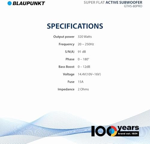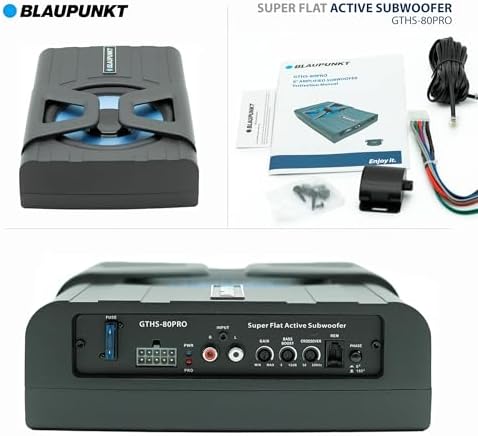 BLAUPUNKT GTHS80PRO 8-inch Amplified PRO Powered Subwoofer Enclosure Car Audio Speaker System Built-in Amplifier Under-Seat Simplifies Installation || GENERAL || Brand : BLAUPUNKT || Model Number : GTHS80PRO | 00000041 | GTHS-80PRO || UPC : 850053034558 || The Blaupunkt GTHS80PRO is an 8-inch amplified subwoofer known for its compact and flat design, making it an ideal choice for under-seat installation in vehicles. It's designed to provide a powerful bass experience without taking up too much space. || || The Blaupunkt PRO Powered Subwoofer Enclosure delivers powerful and precise bass, enhancing your audio experience with deep, rich tones. Its compact design ensures easy integration into any vehicle, while the built-in amplifier simplifies installation. Upgrade your sound system effortlessly and enjoy a heightened audio performance on the road. || || Here are some of the key features of the GTHS80PRO || • Power : It offers a maximum power of 320 watts || • Frequency Response : Ranges from 20 Hz to 250 Hz || • Impedance : 2Ω || • Voltage : 14.4V (10V~16V) || • Phase : 0 – 180° || • Bass Boost : 0 – 12dB || • Fuse : 15A || • Signal-to-Noise Ratio : > 91 dB || • Dimensions : 1378 (L) x 8.90 (W) x 3.15 (H) inches || • Material : Aluminum alloy || || This subwoofer is a great addition to your car stereo system if you're looking to enhance the low-frequency bass volume and improve the overall audio experience. || Its slim profile allows it to fit seamlessly under your car seat, saving space while providing versatile compatibility with a range of car audio systems.