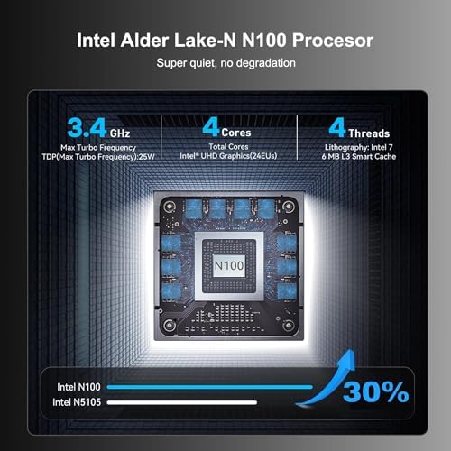 - 🍀Powerful 12th Intel N100 Mini PC: Experience superior performance with the CyberGeek Nano A1 Mini PC, powered by the 12th generation Intel Alder Lake- N100 processor(max up to 3.4GHz, 4C/4T). Significantly faster than Intel N5105 and N5095 CPUs, this mini desktop computer delivers outstanding performance, making it ideal for light office tasks, 4K video playback, online education, and design work.