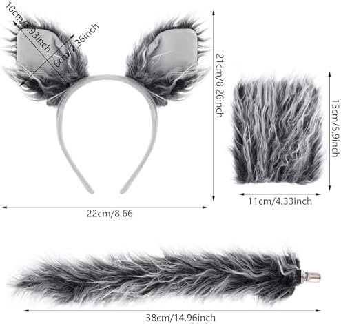 Specifications: Material: plush and polyester Size: Tails 38cm/14.96inch Wolf Ears Headband: 21 x 22cm/8.66inch Gloves: 15 x 11cm/5.9 x 4.33inch Package Includes: 1 x Wolf Ears Headband 1 x Wolf Tail 1 x Wolf Paw Mittens Warm Notes: Please allow slight size errors due to manual measurement.