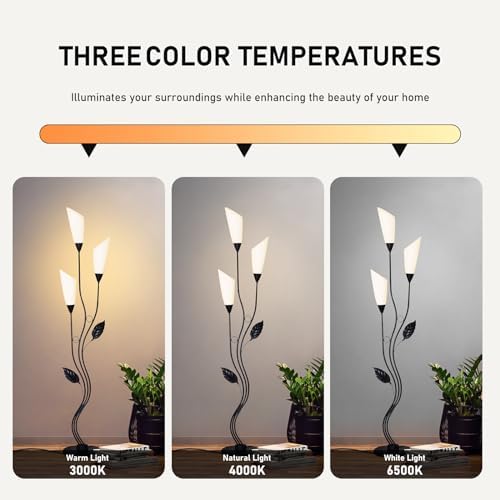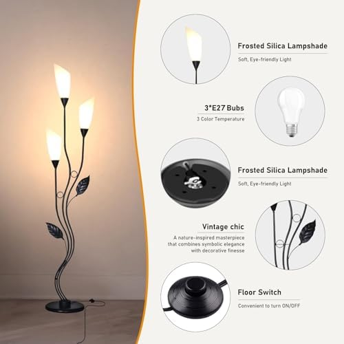 JBZ Flower Floor Lamp for Living Room, 62" Tall Pole Lamp with Foot Switch, with 3 Heads Dimmable LED Lamps for Farmhouse Rustic Bedroom Office, with Plug and 1200LM, 3 Color Temperatures E27