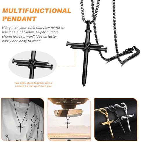 2PCS Nail Cross Pendant for Men, Hanging Cross Car Rearview Mirror Hanging Chain with 3 Nail, Stainless Steel Religious Cross Decoration(Black)