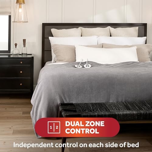Sunbeam Royal Luxe Microplush Heated Blanket snuggles you in cozy warmth on chilly nights. Indulge in its rich and cozy royal fabric to keep you toasty and comfortable while you go to sleep. This 90” x 84" Queen Size electric blanket makes a great addition to any bedroom and the stylish light marble grey color adds a beautiful accent to any decor. Features 2 easy-to-use digital controllers with 12 heat settings for customized warmth and comfort, and a 1 to 12-hour selectable auto shut-off feature for added peace of mind. The heated wires are made with premium components developed with a wire technology that senses and adjusts for continuous heat and safe operation. When ready to clean, simply detach the controllers from the blanket and place into the washing machine for easy care, stays soft after many washes and includes a 5-year limited warranty.