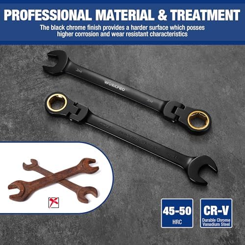 WORKPRO 22-piece Ratcheting Wrench Set with 180° Flex Head, Anti-Slip Tooth, Combination Wrench Sets with Organizer Box, Metric 6-18mm & SAE 1/4-3/4", Black Electrophoretic Coating
