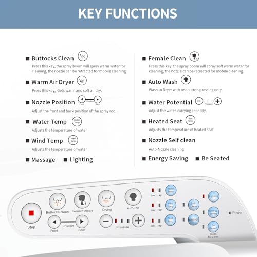 - 𝐄asy 𝐎peration - The bidet toilet seat control panel is conveniently located near the seat, making it easy to use without bending or getting up. You can start or stop any function with a single touch. Easily adjust the water temperature from cold to warm or hot, choose from 4 levels of seat heating, and select from 4 levels of cleansing intensity to customize your comfortable experience according to your personal preferences.