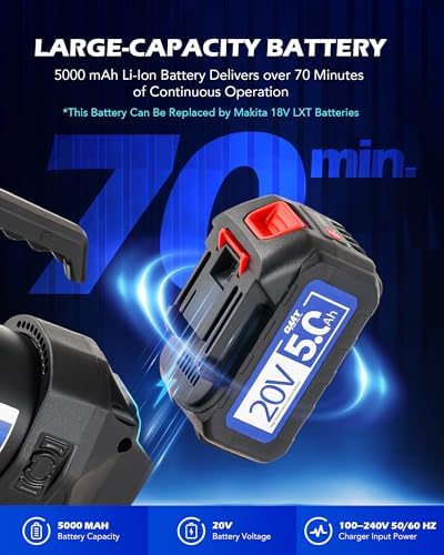 - Long-Lasting Power: With a large-capacity 20V 5000mAh lithium-ion battery, this AC vacuum pump provides an impressive 70 minutes of continuous operation per charge, allowing you to work efficiently without cords, whether on-site or on-the-go.