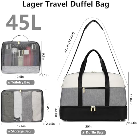 - 【DIMENSIONS】DUFFLE BAG SIZE:20*9.84*13.8 in; TOILETRY BAG SIZE:10.6*5.1*9.1 in;STORAGE BAG SIZE:12.6*2.76*9.45 in; SHOE COMPARTMEENT: 20*9.84*3.54 in