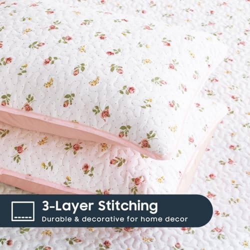 Wake In Cloud - Floral Quilt Set, Coquette Cottagecore Aesthetic Cute Rose Flower for Women Teen Girls, Reversible Lightweight Bedspread Coverlet, 3 Pieces, Pink, Queen/Full Size