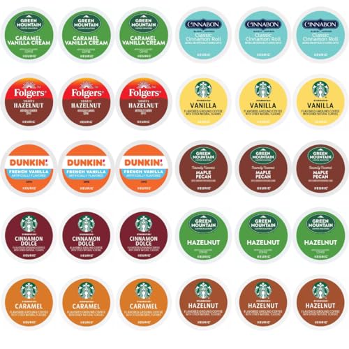 30 Count - Flavored K-cups Coffee Pods Variety Sampler Includes Starbucks Hazelnut, Caramel, Cinnamon Dolce & Vanilla - Green Mountain Caramel Vanilla Cream, Maple Pecan & Hazelnut – Folgers Hazelnut – Dunkin French Vanilla -Cinnabon Cinnamon Roll for Keurig Brewers.