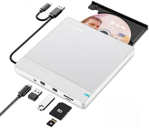 NOLYTH External Blueray/DVD Drive, Portable Bluray Drive External for Laptop with SD TF 2 USB Slots, Slim USB Blu Ray Burner Player for PC Mac Windows MacBook Desktop