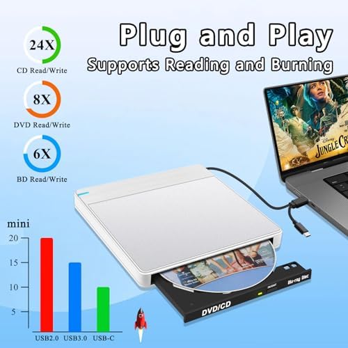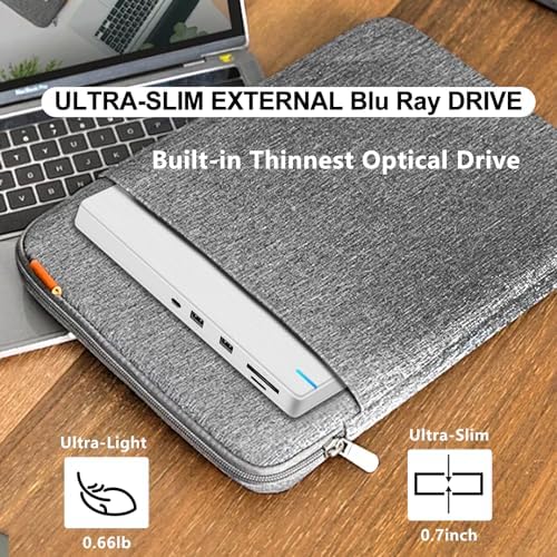 - Ultra-thin and Sleek Bluray Drive: At only 0.7 inches thick and 0.66 pounds, this ultra-slim external blu ray drive is lightweight and easy to carry, very compact and portable. With a white case and silver aluminium top shell, it's a stylish addition to your laptop and a great gift for disc collectors