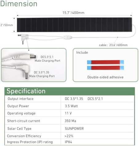- Package Includes: 1x 11V 3.5W Solar Panel with Dual Connector Cable (DC3.5×1.35mm & DC5.5×2.1mm), 2x Adhensive tapes