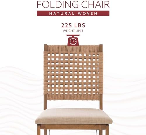Elevate your gatherings with the inviting charm of these folding chairs featuring natural woven backs. Whether accommodating extra guests or optimizing snug spaces, these chairs effortlessly combine practicality and durability. The seagrass backrests exude rustic elegance, woven in an airy pattern reminiscent of midcentury Scandinavian design. Complementing this aesthetic are poly fabric seats, providing comfort, easy upkeep in a linen look. Anchored by solid wood frames with a rich brown stain and lacquer finish, these chairs promise enduring style and resilience.