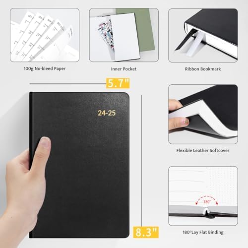 • REMIUM SOFT LEATHER COVER - 2024-2025 Academic Year Vegan Leather Cover Planners are made from 100gsm paper, which prevents ink bleed and maintains the pristine appearance of the planner. The 5.5" x 8.3" size offers enough space for writing and scheduling. Sturdy notebooks withstand frequent transfers in and out of backpacks, briefcases, and cars. Value for money!