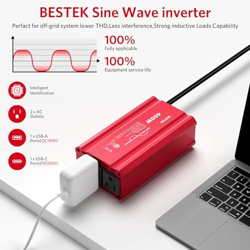 - BESTEK 400W T-Type Sine Wave Car Power Inverter: Its output waveform is delivers a smoothly for sensitive electronics provided by the electric utility, Perfects for off-grid system,Lower THD,Less wear, Strong inductive Loads Capability.Its waveform features a flattened peak, so we call it a T-type sine wave. Recommended for most electrical devices to extend battery life.