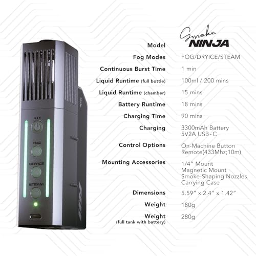 - LONG LASTING PERFORMANCE: With a minimum liquid consumption rate of only 0.5ml per minute, the SmokeNINJA can deliver up to 100 hours of continuous smoke output. This means you can create stunning effects without having to worry about frequent refills.