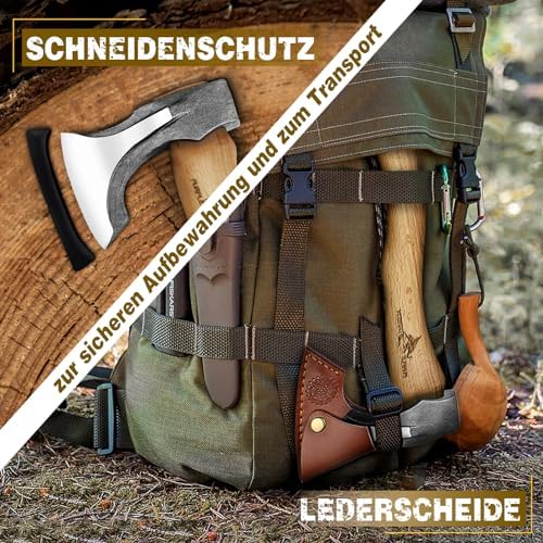 - EXTRA CUTTING PROTECTION: The splitting faces of the axe and hatchet are fitted with rubber protective lips for extra safety, and the bushcraft axe comes with a hand-stitched leather holster. The snap closure holds the outdoor axe securely in place without accidentally damaging other items when stowed in a backpack