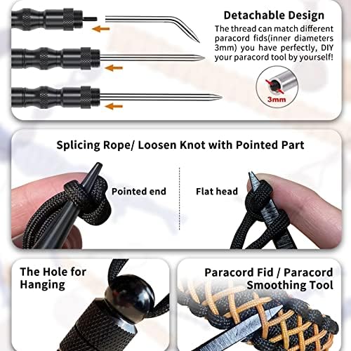 - 【Paracord Jig Kit-Pro Set】-The Set includes: 1PC 6.7" length Marlin Spike-Pro(with pointed end and flat head), 5PCS different diameter paracord FID (their inner diameters are 2mm, 3mm, outer diameter are 3mm, 5mm, 6mm), 2PCS bend needle(their inner diameters are 2mm, 3mm, outer diameter are 3mm, 5mm), 1PC 2.7" large eye blunt needle, 1PC 5.5" tweezer, 1PC 6.4" paracord smoothing tool and 1PC U sewing scissor