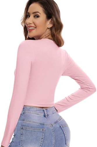 Pink Long Sleeve Crop Top for Women Teen Girl Crew Neck Juniors Fitted Tshirt Cropped Workout Athletic Y2k Full Undershirt Casual Summer Trendy (Pink XXS)