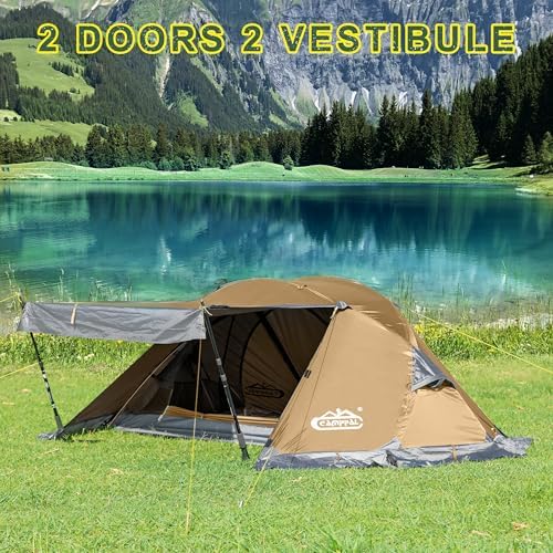 - 【Weatherproof Tent】Stay dry and comfortable in any weather condition with our rainproof and windproof tent. The highly water-resistant fabric and sturdy aluminium poles with secure pegs ensure stability and protection during heavy rain and windy weather. Besides, the built-in snow skirt carries rain and snow away from the hiking tent, keeping you warm and dry in wet or snowy conditions.