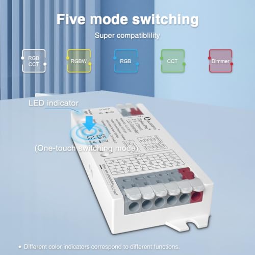 - 5 in 1 Five Modes rgbcct LED controller: There has five modes to connect with led strip: RGBCCT/RGBW/RGB/CCT/Dimmer, and different color indicator correspond to different functions. You can click the "opt" button, short press once to switch one of functions that you want according to the different indicator color, then you can connect between the inport of controller and corresponding wires of your led strip.