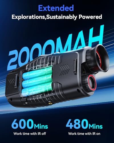 - Sustainable and Reliable: Hunting monocular with a built-in rechargeable 2000mAh battery. Enjoy the convenience and freedom of extended usage without the need for external power sources. Night vision telescope offers up to 480Mins of continuous full infrared usage or an impressive 600Mins with normal settings. No more dependency on AA batteries, embrace a sustainable lifestyle.
