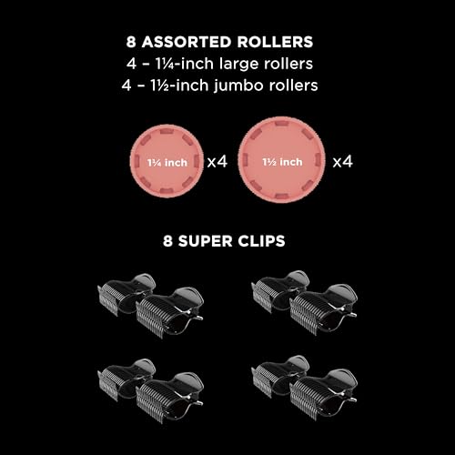 - Full Set: Includes 8 plastic rollers of 2 sizes for custom curls and waves; four 1 1/2 inch jumbo rollers and four 1 1/4 inch extra large rollers include starter grip to prevent hair from sliding. Includes 20 super clips to keep the rollers in place.